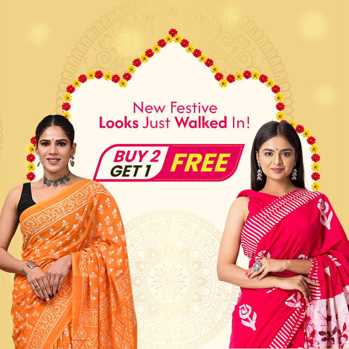 ROVIM Hand Block Printed Cotton Saree with Golden Zari Border & Blouse – Elegant Traditional Wear for Festive & Special Occasions